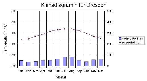 * 5. Nun wird die Einteilung der Achsen mittels der Eigenschaften der Achsen verändert: Format --> Achsen --> ... --> Skalierung --> Ergebnis: (Günstig bzw. notwendig, um Klimadiagramme von verschiedenen Orten vergleichen zu können)