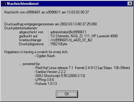 Neben der Tatsache, daß hier wohl unzweifelhaft wichtigere Informationen dargestellt werden, sollten Sie beachten, daß die gesamte Meldung frei konfigurierbar war (der geübte Linuxnutzer wird sogar ein fortune-Cookie entdecken) und im Rahmen von maximal 1.600 Zeichen beliebig gestaltet werden kann. Im Gegensatz zur Windows-Variante hätten Sie ohne viel Mühe zusätzlich die Möglichkeit, einzeln zu entscheiden, welcher Absender eine Nachricht bekommt. Die Kollegen, die häufig drucken, werden es Ihnen vielleicht danken - aber bestimmt nicht, bevor sie alle fortunes auswendig kennen ;-).