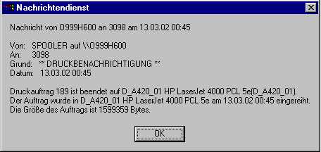 Diese Meldung schickt ein Windows-NT-Printserver. Urteilen Sie bitte selbst, wie wichtig Ihnen die darin enthaltenen Informationen sind. Mir persönlich erschienen sie bisher nie so richtig hilfreich. Sollten Sie sie auch nicht mögen, überlegen Sie kurz welche Alternativen Sie hätten - richtig, den Nachrichtendienst auf Ihrem PC beenden.