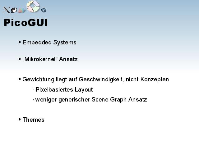 Ebenfalls Idee von einem Graphen zum Rendering. Zielt auf embedded systeme, die haben meistens keine Fließkommaeinheit. Daher pixelbasiertes Layout und weniger generischer Scene Graph als bei Fresco.