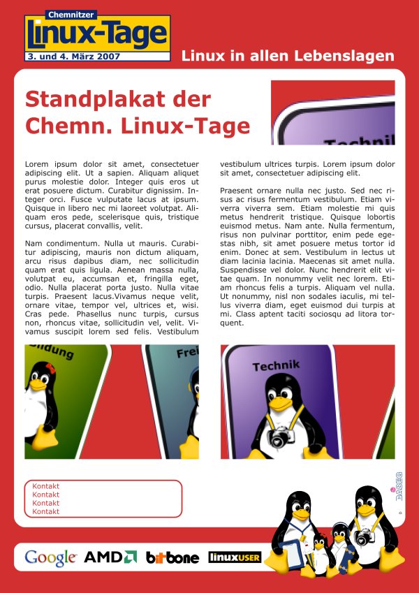Jeder Stand bekommt verbindlich ein Plakat, das so genannte Leitplakat, das einen entsprechenden Rahmen mit Elementen der Corporate Identity der Chemnitzer Linux-Tage (CLT) hat. Dieses Leitplakat soll den Besuchern vor allem die Orientierung erleichtern.